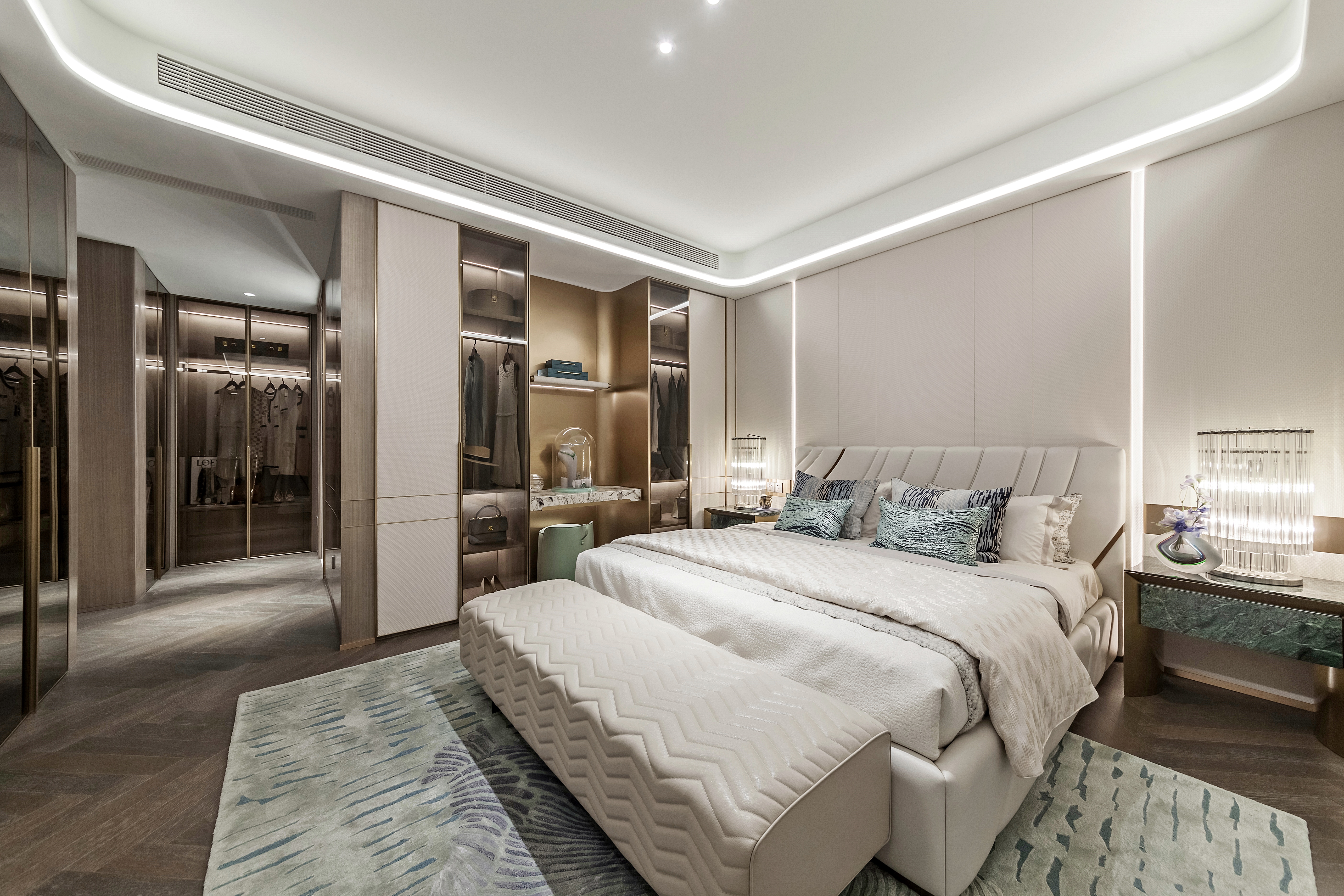 項目特色:內裝呈現純中式風(fēng)格,吊頂呈長(cháng)方形曲面內收,呈三角結構,與外部“如鳥(niǎo)斯革,如翚斯飛”的中式飛檐相互呼應,所涉精裝工法及材料謹遵建發(fā)標準,于細節之處彰顯豪宅品質(zhì)。